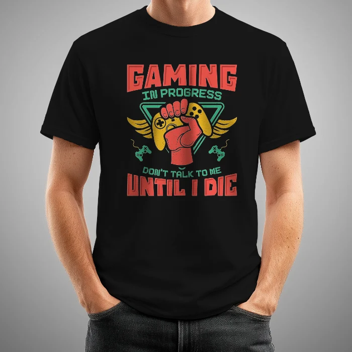 Camiseta para gamers, amantes de los videojuegos, con el texto «Gaming in progress, don’t talk to me until i die», también disponible en blanca.