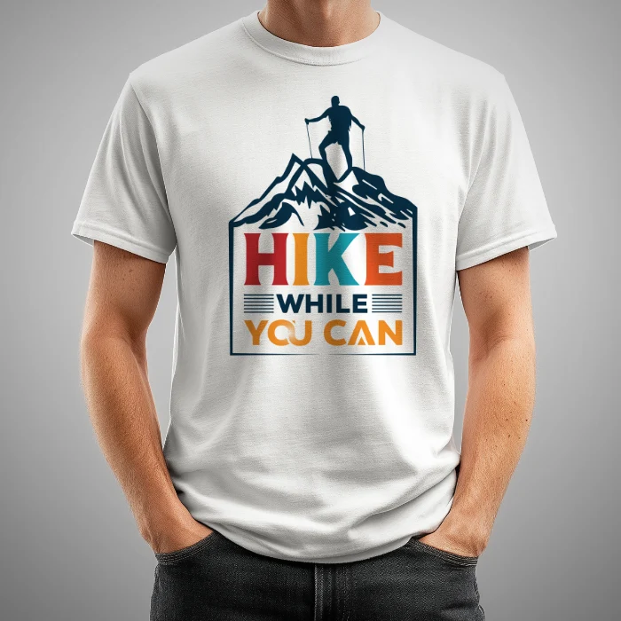 Camiseta aventura, montaña y senderismo, con el texto «Hike while you can». También disponible en negra.