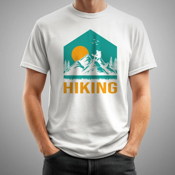 Camiseta aventura, montaña y senderismo, con el texto «Hiking», también disponible en negra.