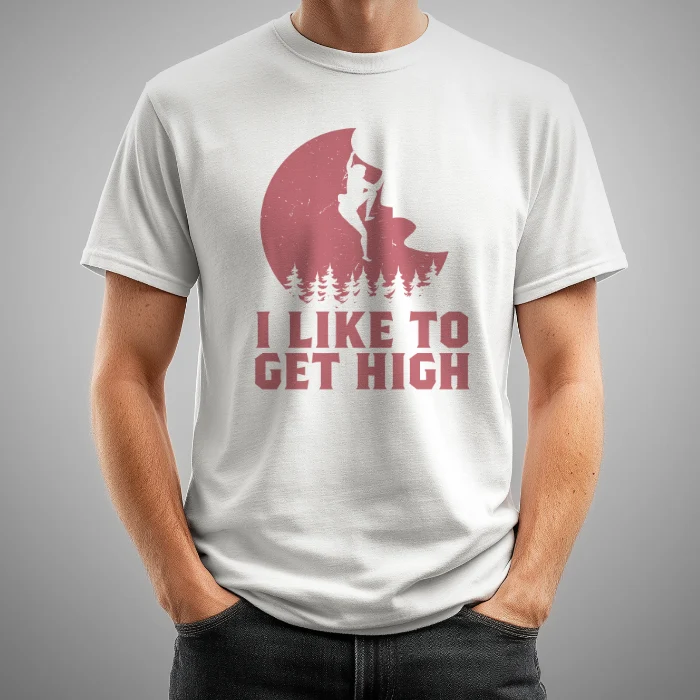 Camiseta aventura, montaña y senderismo, con el texto «I like to get high». También disponible en negra.