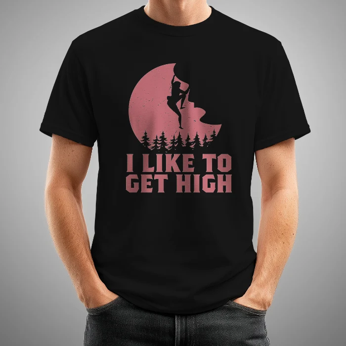 Camiseta aventura, montaña y senderismo, con el texto «I like to get high». También disponible en blanca.