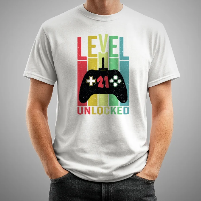 Camiseta para gamers, amantes de los videojuegos, con el texto «Level 21 unlocked», también disponible en negra.