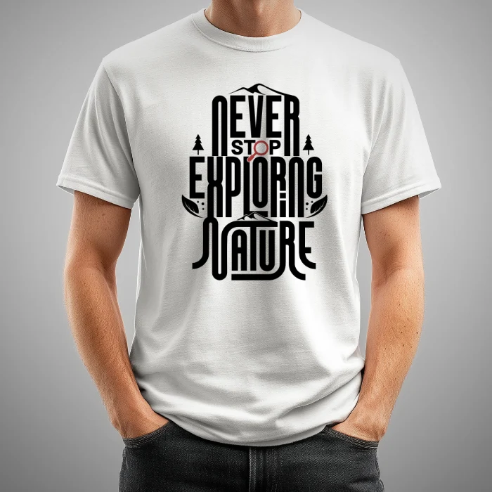 Camiseta aventura, montaña y senderismo, con el texto «Never stop exploring nature». También disponible en negra.